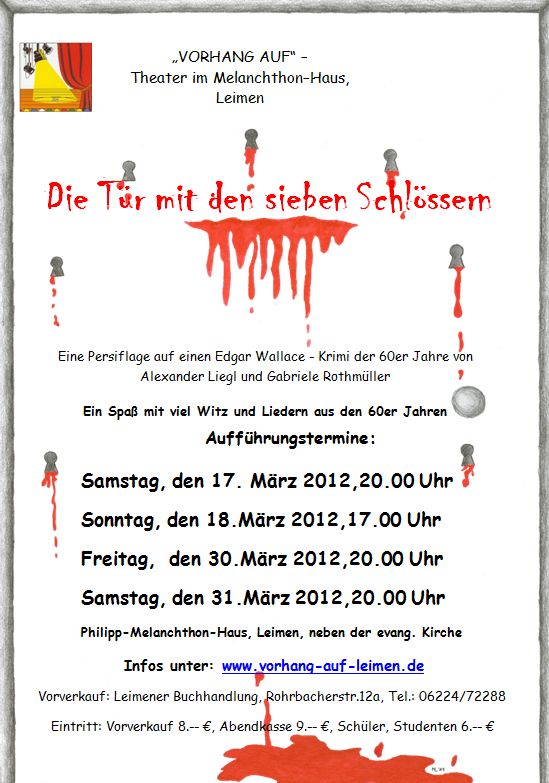 Weiterhin groß ist die Nachfrage nach Karten für die neue „VORHANG AUF“ – Theater im Melanchthon – Haus, Produktion „Die Tür mit den sieben Schlössern“. So gibt es für die Vorstellung am Sonntag, den 18.3.2012 um 17.00 Uhr nur noch wenige Karten an der Tageskasse. Noch Karten im Vorverkauf bei der Leimener Buchhandlung gibt es für die Premiere dieser Persiflage auf einen Edgar Wallace Krimi am Samstag, den 17.3.2012 um 20.00 Uhr. Am meisten verfügbare Karten gibt es noch für die Vorstellungen am Freitag, den 30.3.2012 und am Samstag, den 31.3.2012, jeweils um 20.00 Uhr im Philipp – Melanchthon – Haus.