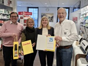 Um die langjährige Parteimitgliedschaft Müllers angemessen zu würdigen, ließen es sich Helga Bender, Mitglied des Kreisvorstandes der FDP Rhein-Neckar, FDP-Landtagskandidatin Claudia Felden und FDP-Ortsvorsitzender Alexander Hahn nicht nehmen und statteten Müller einen Besuch in der Turm-Apotheke ab.