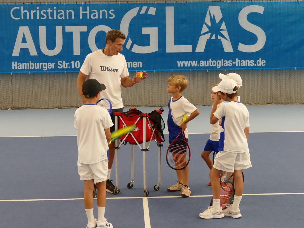 Während auf den beiden äußeren Plätzen die Trainingssessions mit Patrik Kühnen liefen, verfolgten die zahlreichen Mitglieder und Gäste auf dem mittleren Platz -natürlich ausschließlich in Socken und Strümpfen!- das Gewusel der Kinder und Jugendlichen rund um das WILSON-Team. Die Begeisterung der jungen Tennis-Cracks kannte keine Grenzen und alle versuchten, Patrik und die anderen Trainer mit gezielten Passierschlägen über den Platz zu scheuchen.