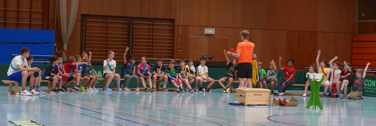 In der Kurpfalzhalle St. Ilgen lauschen 25 Kinder gespannt den Anleitungen – Tischtennis-Ferienprogramm mit Teamgeist und Taktgefühl.