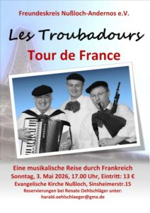 (fwu – 8.4.26) Der Freundeskreis Nußloch-Andernos lädt am Sonntag, 3. Mai 2026, zu einem besonderen Konzertabend in die Evangelische Kirche Nußloch ein. Unter dem Titel „Tour de France“ präsentiert das Ensemble „Les Troubadours“ ab 17 Uhr eine musikalische Reise durch Frankreich. Der Eintritt beträgt 13 Euro.