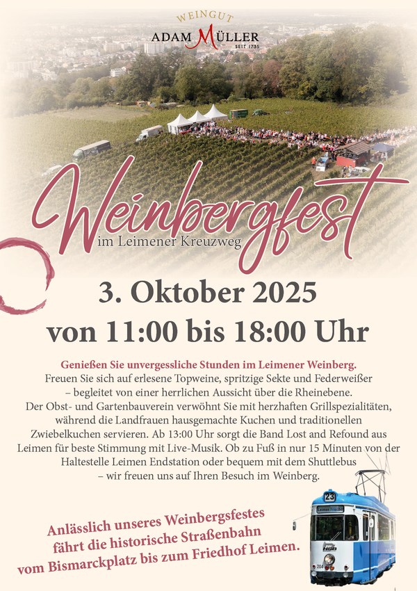 Die gepflegten Reben des Leimener Kreuzwegs bieten nicht nur ein prächtiges Panorama über die Rheinebene, sondern auch den würdigen Rahmen für dieses festliche Ereignis. Unter dem Motto „Genießen Sie unvergessliche Stunden im Leimener Weinberg“ lädt das traditionsreiche Weingut Adam Müller (seit 1735) ein, edle Tropfen, prickelnde Sekte und Federweißer zu verkosten – begleitet vom Duft reifer Trauben und dem Klang beschwingter Livemusik.