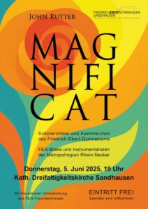 (jw – 13.5.25) Das Friedrich-Ebert-Gymnasium Sandhausen lädt herzlich zum diesjährigen Kammerchorkonzert ein, welches am Donnerstag, den 5. Juni 2025 um 19 Uhr in der katholischen Dreifaltigkeitskirche Sandhausen stattfindet. Auf dem Programm steht das eindrucksvolle Werk „Magnificat“ des britischen Komponisten John Rutter, ein farbenfrohes, energiegeladenes Werk, das traditionelle geistliche Musik mit lateinamerikanischen Rhythmen, lyrischen Melodien und berührenden Klängen verbindet.
