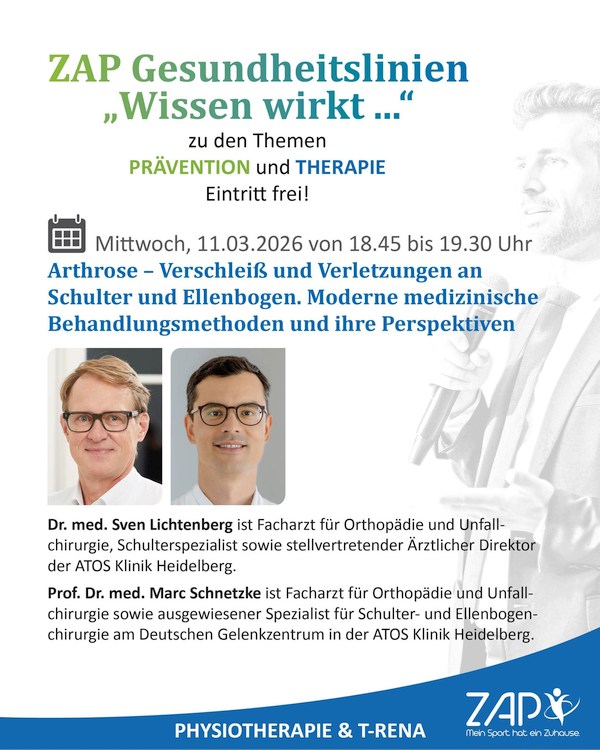 Über diese Fragen spricht die ZAP Gesundheitslinie am 11.03.2026 von 18.45 bis 19.30 Uhr. Referenten sind Dr. med. Sven Lichtenberg von der ATOS Klinik Heidelberg und Prof. Dr. med. Marc Schnetzke vom Deutschen Gelenkzentrum der ATOS Klinik Heidelberg. Der Eintritt ist frei.