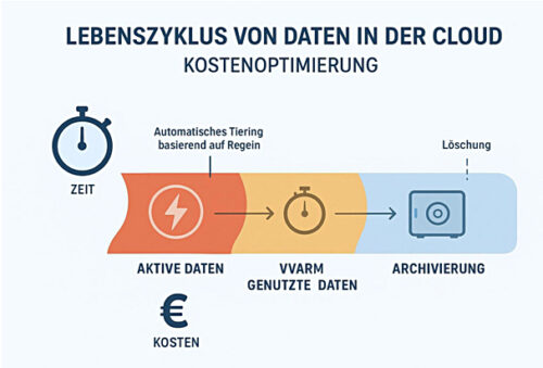 Klare Regeln für den Datenlebenszyklus bilden die Grundlage zur nachhaltigen Reduzierung der Cloud-Speicherkosten. Sie legen fest, wie lange Daten in welcher Klasse verbleiben und wann sie archiviert oder gelöscht werden. Ein Beispiel: Projektdaten bleiben 6 Monate im Standard-Speicher, wandern dann 2 Jahre in Infrequent Access, danach 5 Jahre in Cold Storage und werden anschließend gelöscht, sofern keine gesetzlichen Aufbewahrungspflichten bestehen.