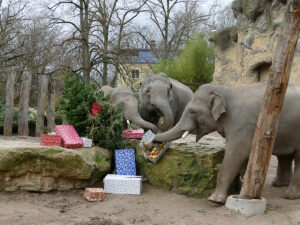 Für das gesamte Team im Zoo Heidelberg ist es inzwischen eine schöne Tradition geworden, den Weihnachts-Wunschzettel zu erstellen und zu überlegen, welche sinnvollen Produkte den Tieren eine zusätzliche Freude bereiten könnten. Viele der ausgewählten Objekte dienen der täglichen Beschäftigung und werden noch weit nach Weihnachten im Einsatz sein. Holzspielzeug für die Lemuren, das mit Snacks gefüllt werden kann, animiert die neugierigen Affen, sich ihr Futter zu „erarbeiten“ und bringt neue Herausforderungen. Nur wenn die Holzklötze geschickt angehoben werden, gelangen die Lemuren an die Leckereien. Spezielle Bungee-Seile, an denen die Tierpfleger Fleischstücke befestigen können, sorgen bei den Großkatzen für ein aktives Fresserlebnis. Stabile Heunetze für die Elefanten, die in mehreren Metern Höhe angebracht werden, bringen die grauen Riesen dazu, sich ausgiebig zum Futter zu strecken.