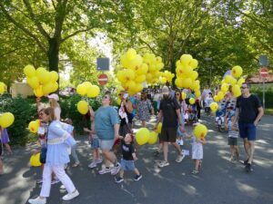 Mit ihren gelben Ballons, an denen die Wunschkarten befestigt waren, nahmen die Kinder stolz am Kerweumzug teil, voller Vorfreude auf den besonderen Moment des Nachmittags: das gemeinsame Steigenlassen der Wunschballons auf dem Rathausplatz. Als die Ballons dort in den Himmel stiegen, war es, als würden kleine Botschaften der Hoffnung in alle Richtungen davonziehen, begleitet von staunenden Blicken- ein bewegendes Bild, das sich sicher in viele Herzen eingebrannt hat.