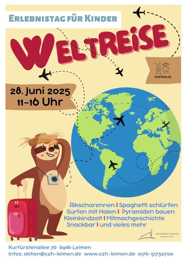 (geg – 9.6.25) Wenn am 28. Juni kleine Abenteurer mit Rucksack und Riesenaugen über die Kurfürstenallee tapsen, dann ist klar: Der „Erlebnistag für Kinder“ im Christlichen Zentrum Leimen lädt wieder zur großen Weltreise! Und das Beste daran? Die Reise kostet keinen Cent – außer vielleicht ein bisschen Fantasie.