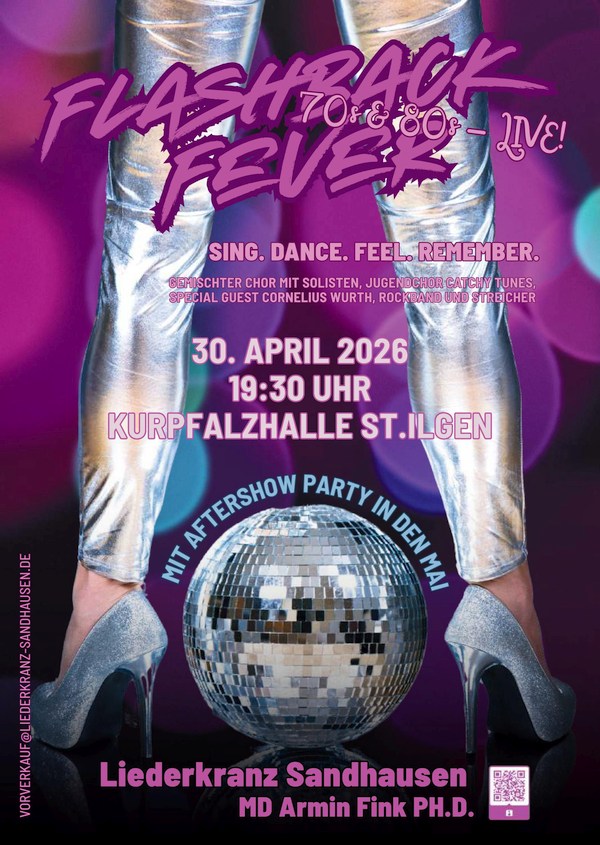 Am 30. April 2026 wird die Kurpfalzhalle St. Ilgen zur Bühne für eine große musikalische Zeitreise. Der Liederkranz Sandhausen 1906 e.V. lädt zu seinem Chorprojekt „Flashback Fever“ – 70’s & 80’s live – sing. dance. feel. remember ein. Los geht es um 19.30 Uhr, Einlass ist ab 18.30 Uhr. Danach geht es für die Gäste des Chorprojekts weiter zur Aftershow-Party in den Mai in der Ägidiushalle.