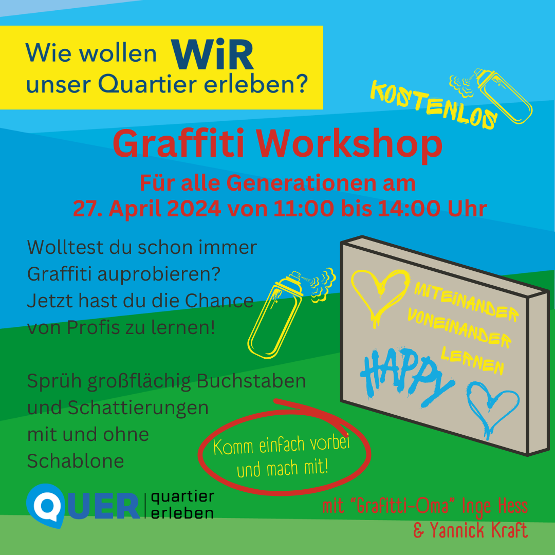 · Graffiti-Workshop mit „Grafitti-Oma“ Inge Hess und Yannick Kraft: Wolltest du schon immer mal Graffiti sprühen? Jetzt hast du die Chance, von den Profis zu lernen! Sprüh großflächig Buchstaben und Schattierungen mit und ohne Schablone.