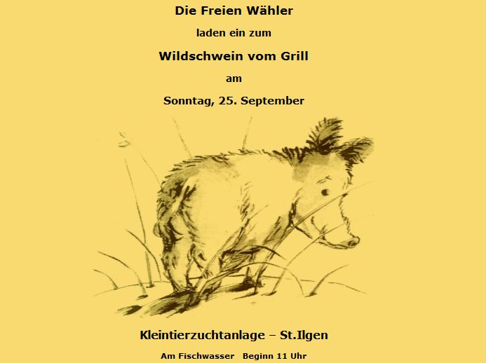 Die Freien Wähler laden zum Wildschweinessen. Näheres entnehmen Sie bitte dem Plakat.