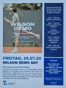 Den ganzen Nachmittag bis in den späten Abend ist für Unterhaltung mit WILSON und Patrik Kühnen gesorgt, es gibt natürlich auch kühle Getränke, Bratwürste und Steaks im Brötchen auf der Sonnenterrasse, von der aus man das Geschehen auf dem M-Platz bestens verfolgen kann. Kleine Überraschungen und Gewinnspiele gehören ebenso zum Programm, wie Services und Angebote von WILSON rund um den Tennissport. Unser Kooperationspartner aus Nußloch Zentrum Aktiver Prävention ZAP ist ebenfalls mit zwei Ständen auf dem Clubgelände vertreten.