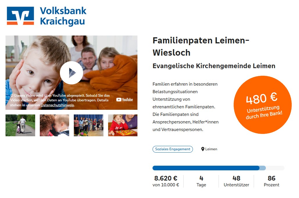 (pm – 17.1.25) Wir, die evangelische Kirchengemeinde Leimen-Wiesloch, brauchen Eure Hilfe! Wir sammeln Spenden für unser Familienpaten-Programm über das Crowdfunding-Portal der Volksbank. Dort könnt ihr auch mehr darüber erfahren, wenn ihr noch nichts davon gehört habt.