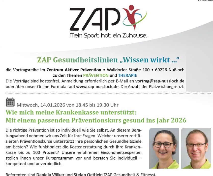 (zap – 12.1.26) Die richtige Prävention ist so individuell wie Sie selbst. An diesem Beratungsabend nehmen wir uns Zeit für Ihre Fragen: Welcher unserer zertifizierten Präventionskurse unterstützt Ihre persönlichen Gesundheitsziele am besten?