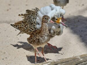 Besonders eindrucksvoll zeigen sich derzeit die Kampfläufer. Die Männchen präsentieren sich in ihrem nur wenige Wochen im Jahr sichtbaren Prachtkleid mit auffälligen Federkragen und liefern sich kleine Schaukämpfe um die Gunst der Weibchen. Dieses spektakuläre Balzverhalten gehört zu den faszinierendsten Naturphänomenen der Vogelwelt und lässt sich aktuell im Zoo aus nächster Nähe beobachten.