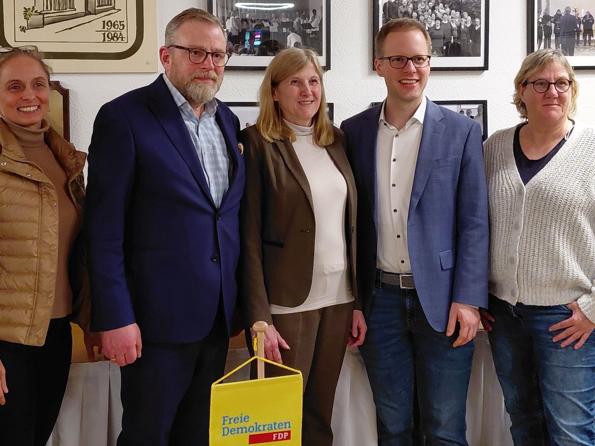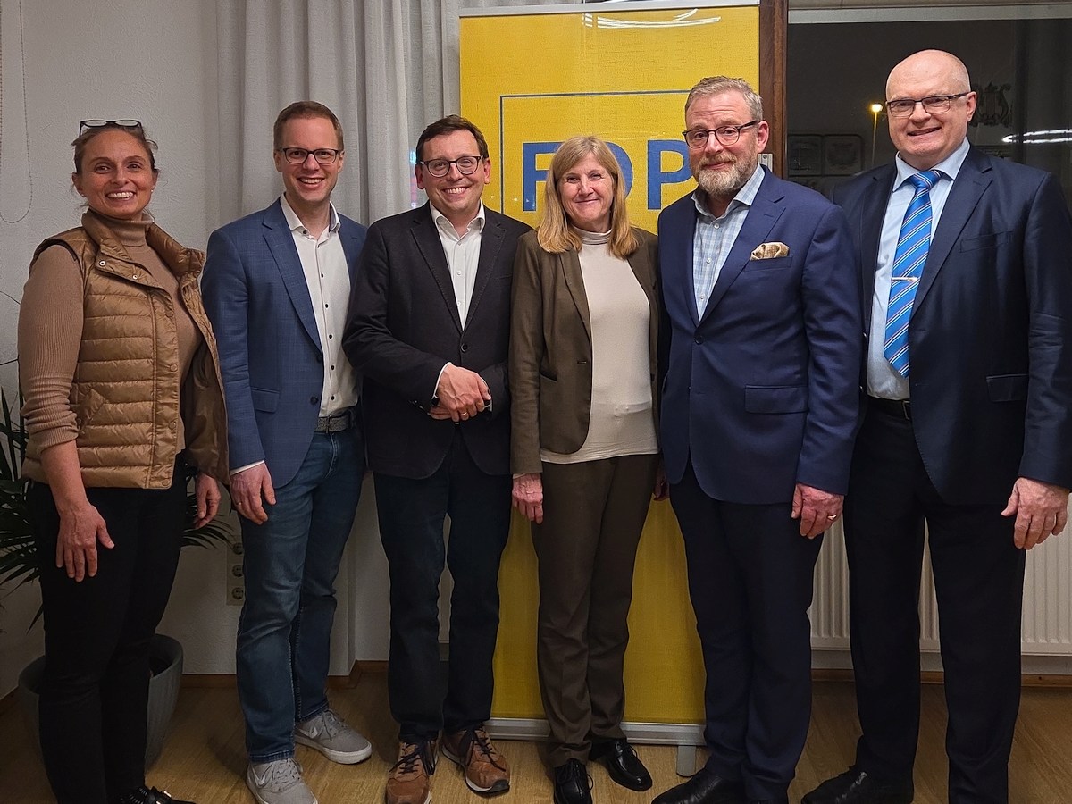 v.l.n.r.: Vera Pfirmann (FDP Walldorf), Dr. Jens Brandenburg (Parl. Staatssekretär a.D. und MdB a.D.), Alexander Hahn (FDP Leimen), Claudia Felden (FDP-Landtagskandidatin), Karl Graf Stauffenberg, Dr. Matthias Spanier (FDP Wiesloch)