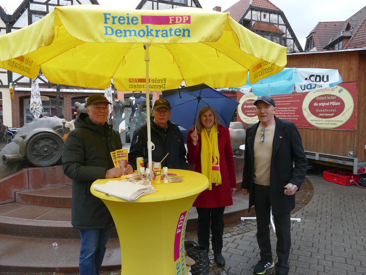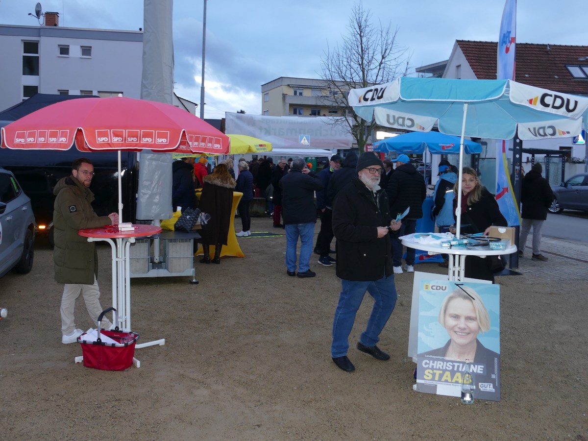 Die AfD brachte ihren Direktkandidaten Thomas Nitz mit und zusätzlich den Bundestagsabgeordneten Achim Köhler. Die CDU wurde u.a. von MdL Christiane Staab vertreten. Bei der FDP stand erneut Claudia Felden – als Landtagskandidatin, nicht als Bürgermeisterin. Die SPD hielt ebenfalls Präsenz, wie es sich gehört. Man sprach miteinander. Bürger mit Politikern. Politiker untereinander. Kein Schlagabtausch, eher Marktplatzton. Man kennt sich.